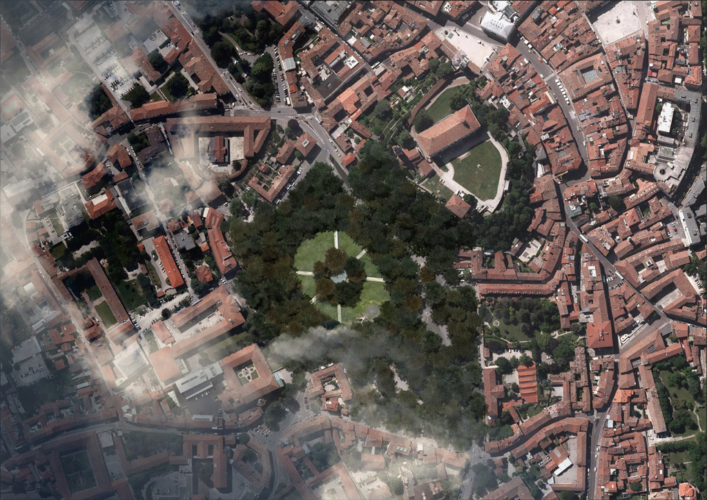 Il bosco unifica, a tratti cancella, nasconde sotto ad un grande ombrello il disordine del sottobosco. Il disordine viabilistico, la sosta, l’asfalto, il disordine del nuovo parcheggio interrato, gli svincoli tutto questo potrebbe idealmente essere ammorbidito, attenuato mediante la realizzazione di una unica grande foresta urbana.
