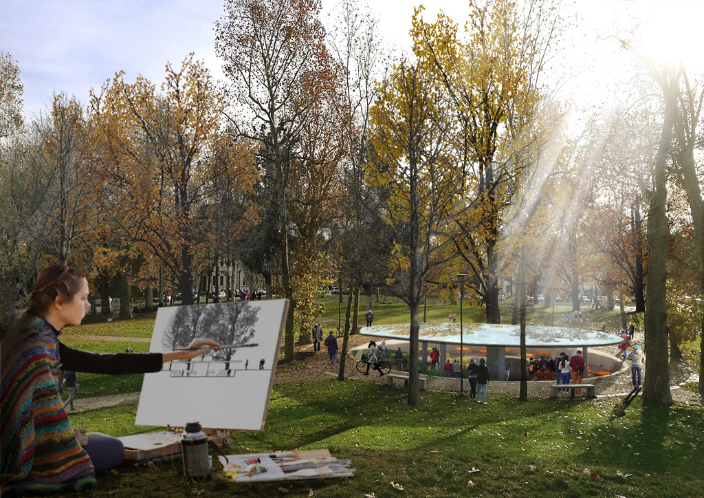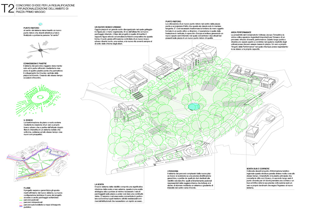 Con questa idea puntiamo a rovesciare l’attuale rapporto di figura-sfondo. L’ellisse che ora galleggia in un “terrain vague” privo di regole, schiacciata tra flussi e necessità automobilistiche, diverrebbe da pieno, qual’è ora, a vuoto, una radura… Una radura d’incontro. Uno spazio… non una superficie.