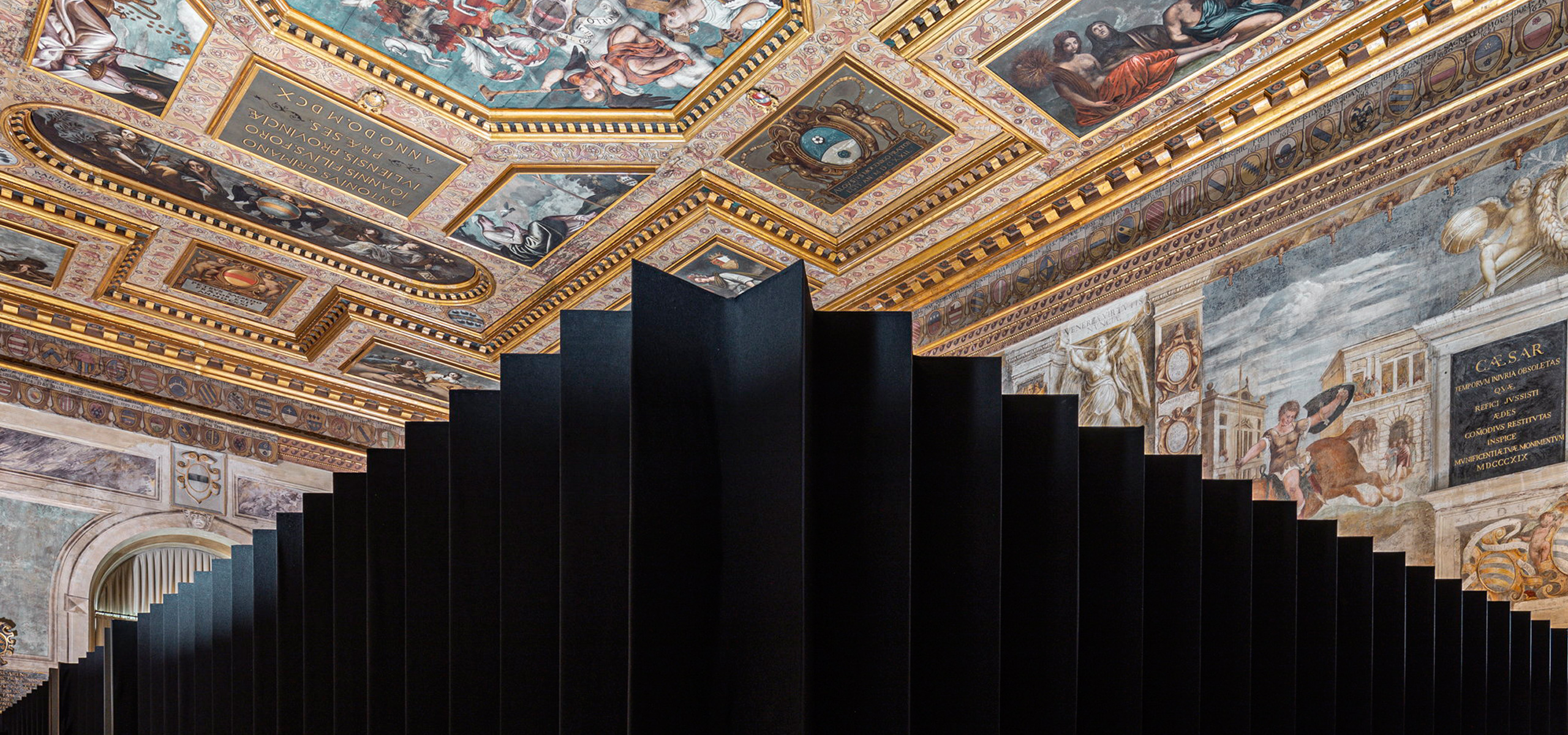 L’allestimento alterna densità e pause.